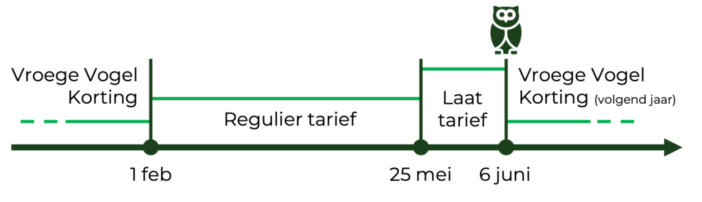 Inschrijven is gewenst vóór zondag 31 mei, of de datum waarop gestelde deelname-limiet is bereikt. Bij inschrijving na 31 mei ontvang je geen gepersonaliseerd startnummer. Vanaf maandag 25 mei gaan de inschrijftarieven omhoog.